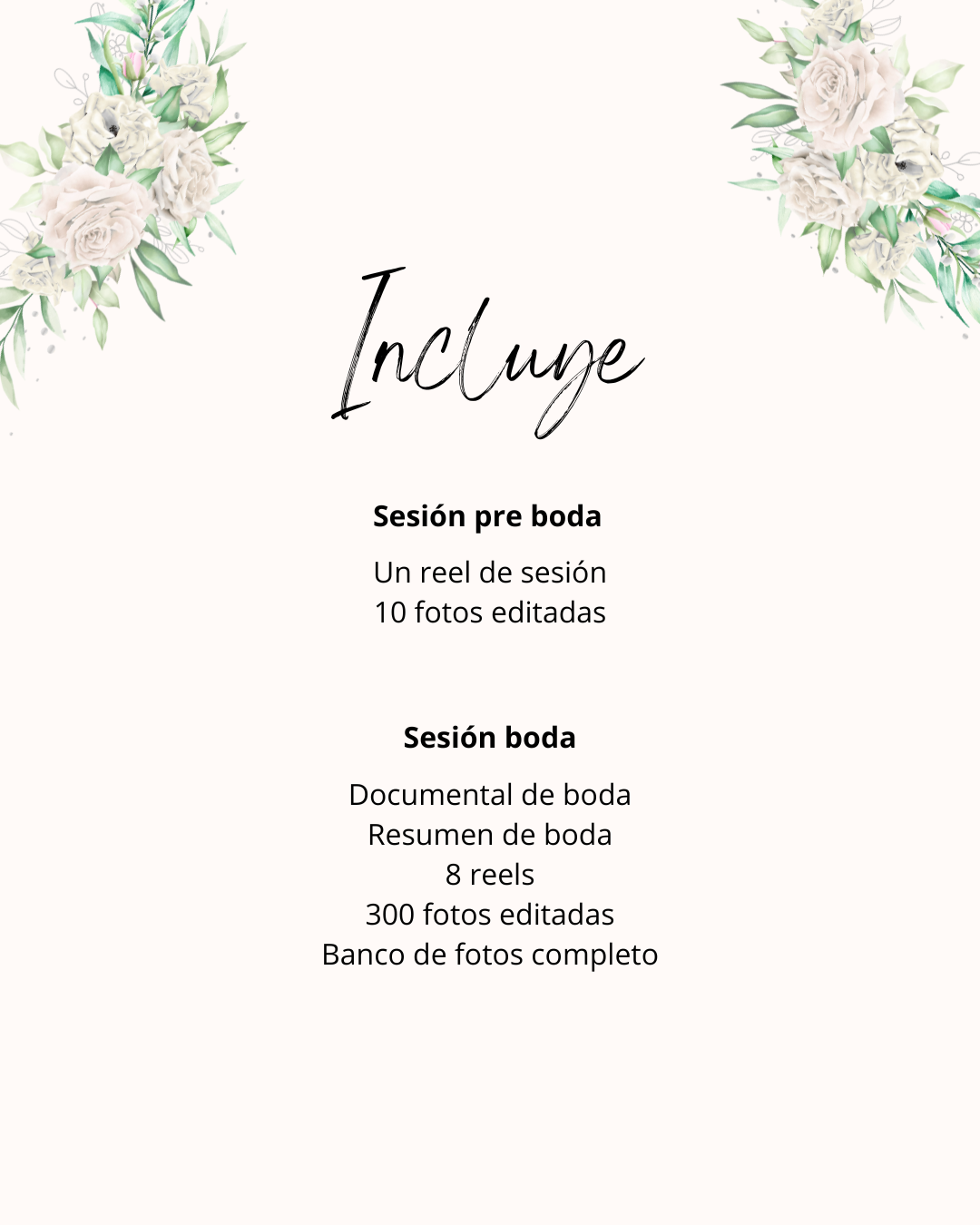 Sesión pre boda: 3 hrs + 1 reel + 10 fotos editadas. Sesión boda: 10 hrs + documental + resumen + 8 reels + banco completo de fotos (1000+) + 300 fotos editadas.